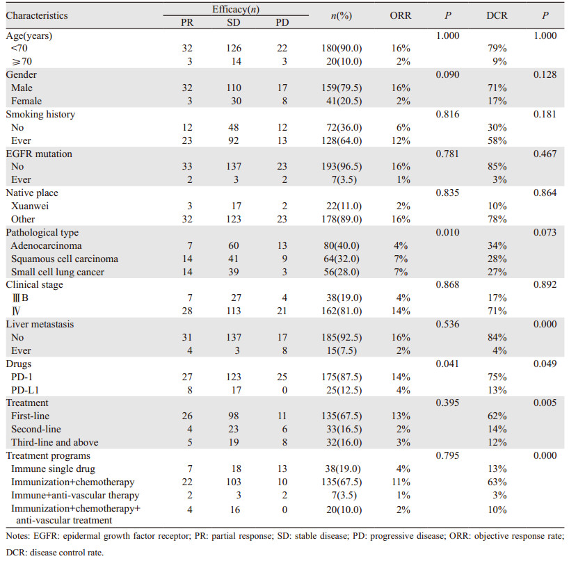 2 结果 2.1 患者临床特征本研究共入组200例患者,临床指标与免疫治疗疗效相关性见表 1。