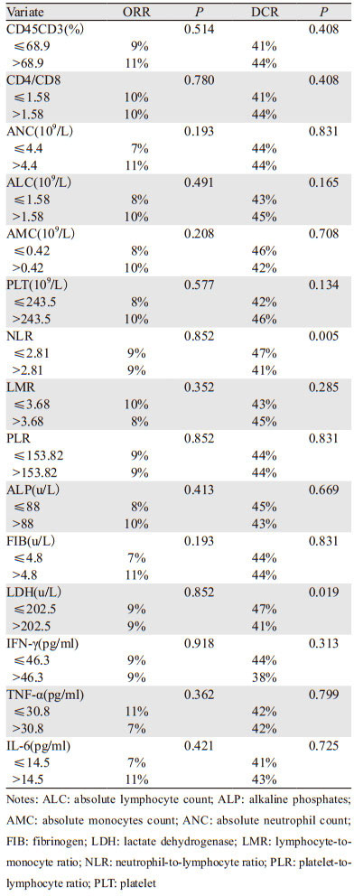 1.4 统计学方法使用SPSS25.0统计软件对临床指标和外周血指标进行回顾性数据分析。疗效分析中,单因素分析采用χ2检验, 多因素分析采用Logistic回归分析,受试者工作曲线(ROC)计算联合指标的曲线下面积(AUC),探究联合指标对免疫治疗疗效的预测价值。生存分析中,单因素分析采用Kaplan-Meier方法,多因素分析采用Cox比例风险回归模型。治疗前后外周血液学指标与疗效相关性采用非参数检验中两个相关样本的Wilcoxon方法进行比较,P < 0.05为差异有统计学意义。
