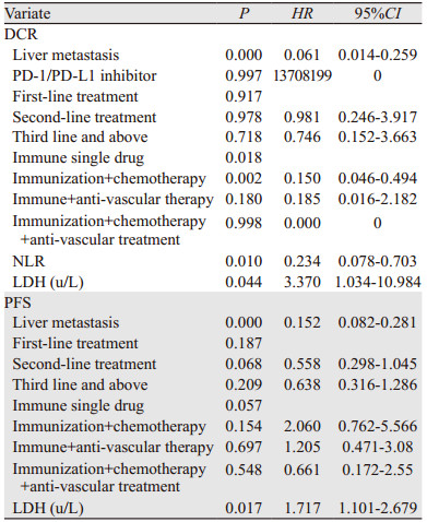 将影响疗效的单因素分析中有统计学意义的变量因素纳入Logistic多因素回归分析模型,包括有无肝转移、PD-1/PD-L1抑制剂、免疫治疗线数、免疫治疗方案、NLR、LDH。DCR为反应变量。结果显示,无肝转移、免疫联合化疗、NLR≤2.81、LDH≤202.5 u/L的疗效更佳,见表 3。