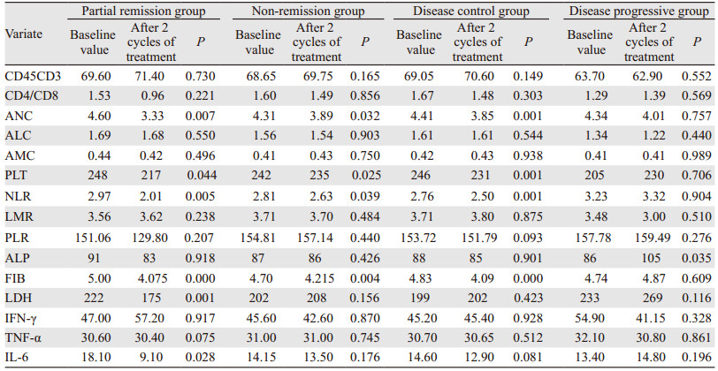 2.4 免疫治疗前后外周血指标变化与疗效的相关性对各疗效组治疗前后外周血指标进行分析,结果显示,部分缓解组(PR):ANC、PLT、NLR、FIB、LDH、IL-6在两周期治疗后较治疗前明显下降(P < 0.05); 无缓解组(SD+PD):ANC、PLT、NLR、FIB在两周期治疗后较治疗前降低(P < 0.05)。疾病控制组(PR+SD):ANC、PLT、NLR、FIB在两周期治疗后较治疗前明显下降(P < 0.05); 疾病进展组(PD):ALP在两周期治疗后较治疗前明显升高(P < 0.05),见表 4。