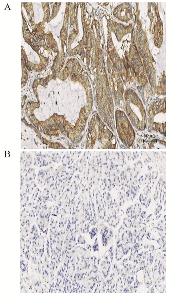 | 图 1 S100A16在胰腺癌(A, ×400)和癌旁组织(B, ×400)中的免疫组织化学结果 Figure 1 Immunohistochemical results of S100A16 expression in pancreatic cancer(A, ×400) and adjacent tissues(B, ×400) |