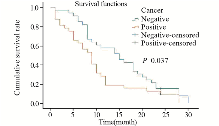 Kaplan-Meier生存曲线、Log rank检验结果显示S100A16蛋白阳性表达组的中位生存时间为8月,S100A16蛋白表达阴性的中位生存时间为19月。S100A16蛋白阳性表达预后较阴性表达差异有统计学意义(P=0.037),见图 2。