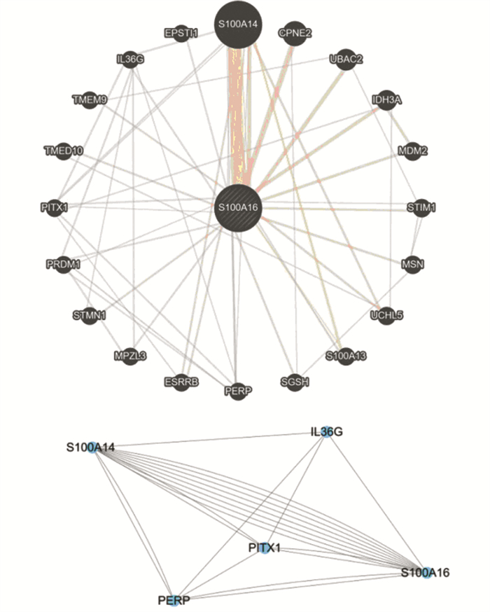 数据库预测分析分子相互作用网络图,展示了与目的基因有直接相互作用的所有分子之间的相互作用关系网络,见图 3。PPI预测S100A16相互作用蛋白包括S100A14、CPNE2、UBAC2、IDH3A、MDM2、STIM1、MSN、UCHL5、S100A13、SGSH、PERP、ESRRB、MPZL3、STMN1、PRDM1、PITX1、TMED10、TMEM9、IL36G、EPSTI1。使用Cytoscape的MCODE插件进行关键子网络分析,其中S100A14、IL36G、PITX1、PERP在相互作用网络中具有重要作用。