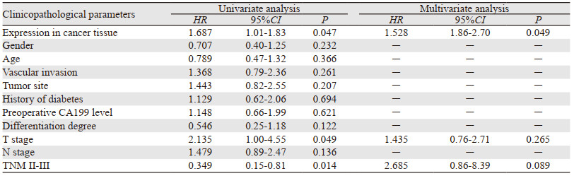 截至2021年12月,65例胰腺癌患者仅有5名患者生存。生存分析结果显示S100A16表达水平是胰腺癌患者预后的独立预后因素,并且S100A16蛋白表达阳性是S100A16蛋白表达阴性患者死亡风险的1.528倍,见表 3。