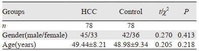 2 结果 2.1 两组研究对象的一般资料比较本研究共纳入肝癌患者78例,健康对照组78例。肝癌组男45例、女33例,平均年龄为(49.44±8.21)岁;健康对照组男42例、女36例,平均年龄为(48.98±9.34)。两组研究对象在年龄和性别资料上差异均无统计学意义(P > 0.05),见表 1。