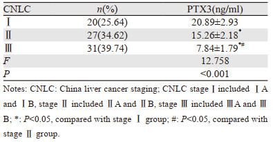 2.3 不同分期肝癌患者血清中PTX3表达的比较Ⅰ期肝癌组血清PTX3水平高于Ⅱ期组,Ⅱ期肝癌组血清PTX3水平高于Ⅲ期组,差异有统计学意义(P < 0.05),见表 2。