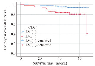 | 图 1 有无脉管侵犯的Ⅰ期胃癌患者Kaplan-Meier生存曲线 Figure 1 Kaplan-Meier survival curves of stage Ⅰ gastric cancer patients with and without vascular invasion |