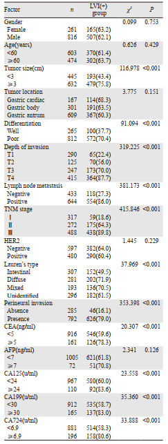 胃癌是常见的消化系统肿瘤之一,现阶段我国仍然属于胃癌高发病率、高死亡率的国家[1]。随着疾病的进展,肿瘤细胞逐渐侵犯周围的血管和淋巴管,致使肿瘤发生转移和扩散,故而,脉管侵犯(lymphovascular invasion, LVI)在肿瘤的发生发展中扮演着重要角色[2]。许多研究表明,有无脉管侵犯是影响肿瘤患者复发、转移的重要因素,并且与胃癌的预后密切相关[2-4]。脉管侵犯作为一项独立的预后指标,对胃癌患者手术方式及后续辅助治疗方案的选择具有重要的指导意义[5]。2021年CSCO指南推荐TNM分期为Ⅰ期且伴有脉管侵犯的胃癌患者进行研究性辅助化疗,但脉管侵犯对于Ⅰ期患者的预后影响尚存在争议,对于是否应行辅助化疗在临床工作中尚未达成共识。近年来,影像学诊断技术快速发展,但对患者脉管侵犯的诊断帮助微乎其微,仍然需要术后病理组织学诊断[6]。因此,本研究回顾性分析了手术切除的1 077例胃癌标本,并根据其病理特征及脉管侵犯情况,研究这部分胃癌患者发生脉管转移的特点及规律,选取其中Ⅰ期胃癌病例317例,利用生存分析研究脉管侵犯与患者5年总体生存率的关系,旨在为胃癌患者的诊治提供帮助。