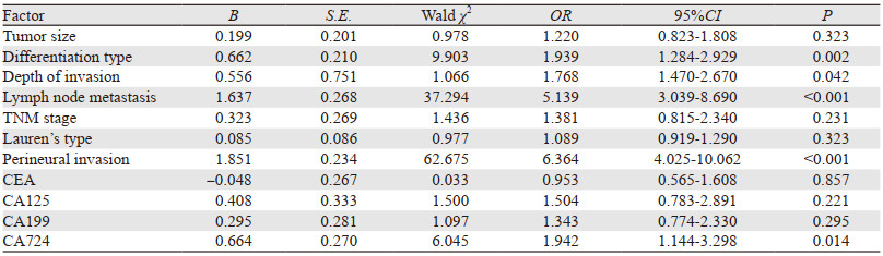 2 结果 2.1 临床病理特征与脉管侵犯的关系单因素分析结果显示,肿瘤大小、分化类型、浸润程度深、有淋巴结转移、TNM分期晚、Lauren分型差、侵犯神经、CEA、CA125、CA199、CA724升高是发生脉管侵犯的危险因素(P < 0.05),而与性别、年龄、肿瘤部位、HER2状态、AFP水平无明显相关性(P > 0.05),见表 1。多因素分析结果显示,分化类型、淋巴结转移、神经侵犯、CA724升高是发生脉管侵犯的独立风险因素,其OR值(95%CI)分别为1.939(1.284~2.929)、5.139(3.039~8.690)、6.364(4.025~10.062)、1.942(1.144~3.298)(P < 0.05),见表 2。