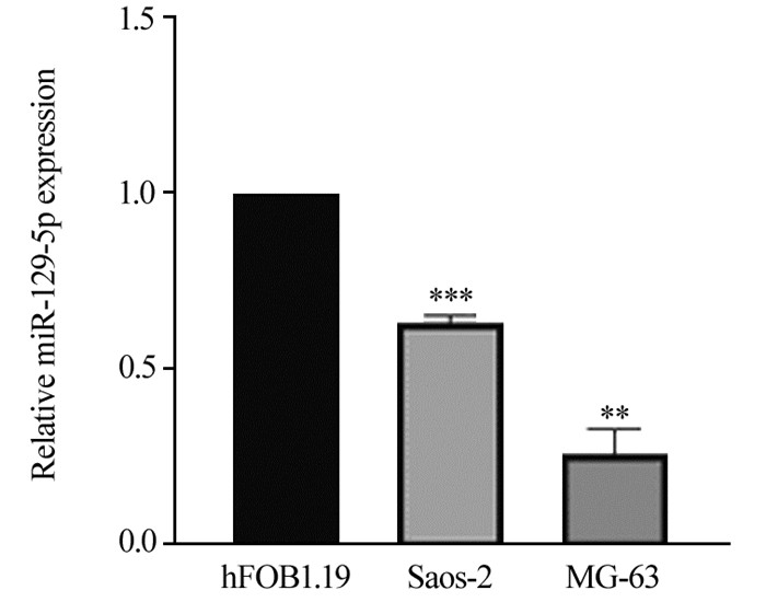 2 结果 2.1 miR-129-5p在骨肉瘤细胞中低表达RT-PCR结果显示,与成骨细胞hFOB1.19相比,miR-129-5p在骨肉瘤细胞Saos-2(P=0.0010)和MG-63(P=0.0028)中的表达量有不同程度降低,见图 1。