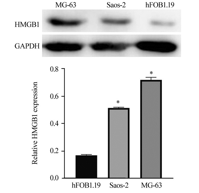 | *: P < 0.05, compared with hFOB1.19 cell line. 图 2 HMGB1在不同骨肉瘤细胞株中的表达情况 Figure 2 Expression of HMGB1 in different osteosarcoma cells |