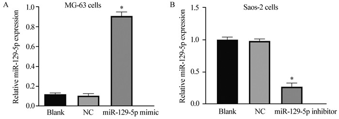 1.3 实验分组及细胞转染将对数生长期MG-63、Saos-2细胞接种到6孔板中,培养至细胞融合度约80%。细胞转染按照试剂说明书进行,根据转染的目的基因不同进行如下分组:miR-129-5p inhibitor组、miR-129-5p mimic组、溶剂为NC序列阴性对照组(NC组)及空白对照组。将配好的转染液加入各孔细胞中,置于37℃培养箱中,OPTI无血清培养基培养6 h后,更换为完全培养基继续培养。