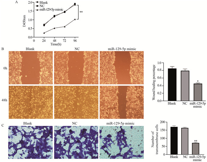 | *: P < 0.05, **: P < 0.01, compared with NC group. 图 4 CCK-8法(A)、划痕实验(B)及Transwell迁移实验(C)分别检测转染miR-129-5p mimic对MG-63细胞增殖和迁移的影响 Figure 4 Effects of miR-129-5p mimic transfection on proliferation and migration of MG-63 cells detected by CCK-8 assay(A), scratch assay(B) and Transwell migration assay(C) |