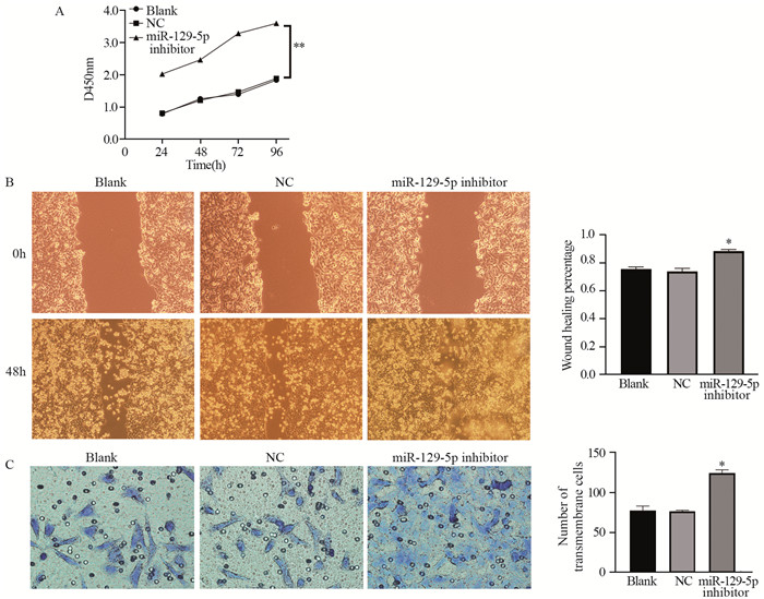CCK-8检测结果表明,在Saos-2细胞中转染miR-129-5p inhibitor后,其增殖能力提高,与NC组相比,差异有统计学意义(P=0.0023),见图 5A;划痕实验显示,在Saos-2细胞中转染miR-129-5p inhibitor后,细胞迁移能力增强,与NC组相比,差异有统计学意义(P=0.0348),见图 5B,Transwell迁移实验得出相同的结论(P=0.025),见图 5C。