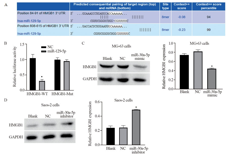 MG-63、Saos-2细胞系分别转染miR-129-5p mimic、miR-129-5p inhibitor后,Western blot结果表明:miR-129-5p mimic组细胞中HMGB1的表达量降低(P=0.0298),见图 6C;miR-129-5p inhibitor组细胞中HMGB1的表达量显著升高(P=0.0432),见图 6D,结果说明miR-129-5p与HMGB1基因之间存在靶向作用关系。
