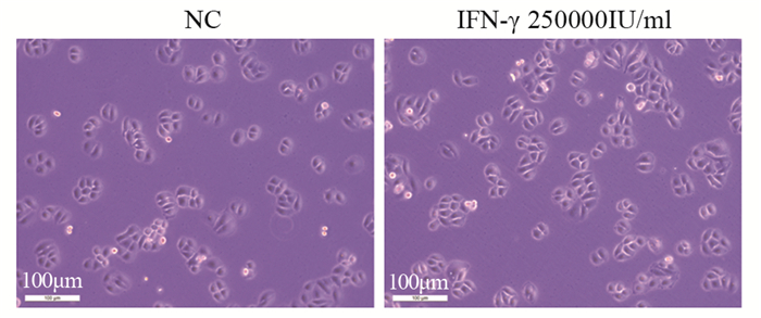 2 结果 2.1 IFN-γ作用后Eca9706细胞形态未发生明显变化IFN-γ作用24 h后,与对照组(NC组)相比较,IFN-γ(250 000 IU/ml)作用后的处理组细胞形态并未发生明显变化,见图 1。