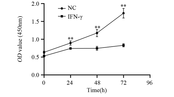 | **: Compared with NC group, P < 0.01. 图 2 IFN-γ抑制Eca9706细胞的增殖能力 Figure 2 IFN-γ inhibited proliferation of Eca9706 cells |