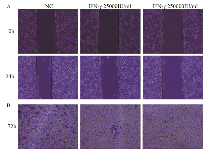 细胞划痕实验和Transwell实验结果显示,与NC组相对比,IFN-γ作用后的处理组划痕愈合率和穿膜细胞数均显著降低(P=0.00011,P=0.00013)。划痕愈合率为:NC组(22.53±0.13)%、IFN-γ(25 000 IU/ml)组(19.73±0.58)%、IFN-γ(250 000 IU/ml)组(5.8±0.43)%;Transwell穿膜细胞数为:NC组(311±12)个、IFN-γ(25 000 IU/ml)组(35±6)个、IFN-γ(250 000 IU/ml)组(7±2)个,见图 3。