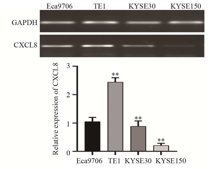 | **: P < 0.01, compared with Eca9706 cells. 图 4 RT-PCR法检测四种食管癌细胞中CXCL8的相对表达 Figure 4 Relative expression of CXCL8 in four esophageal cancer cells detected by RT-PCR |