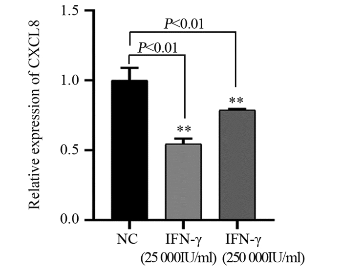 Quantitative Real-time PCR检测结果显示,与阴性对照组(NC组)比较,IFN-γ(25 000 IU/ml)组和IFN-γ(250 000 IU/ml)组CXCL8的相对表达量均明显下调(P=0.0089),IFN-γ(25 000 IU/ml)组为(0.52±0.03),IFN-γ(250 000 IU/ml)组为(0.78±0.01),见图 5。