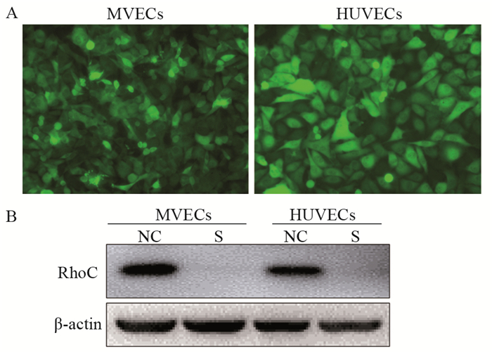 2 结果 2.1 RhoC shRNA慢病毒载体转染情况慢病毒载体转染48 h后,荧光显微镜下观察绿色荧光蛋白表达情况,MVECs和HUVECs细胞转染效率均可达到80%以上,见图 1A;Western blot法检测发现,慢病毒载体转染MVECs和HUVECs细胞后,与NC组相比,S组RhoC蛋白表达量明显降低(P=0.003、0.001),见图 1B。