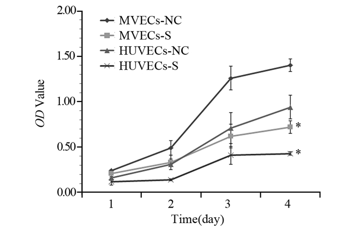 CCK-8结果显示:经条件培养基对骨髓瘤RPMI8226细胞连续培养4天后,与NC组相比,S组细胞增殖能力均明显降低(P=0.004、0.006),见图 2。