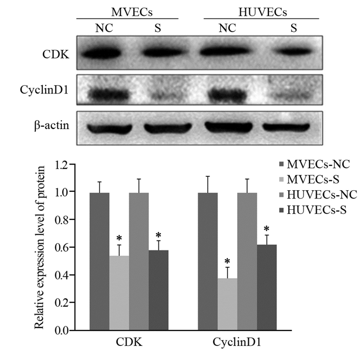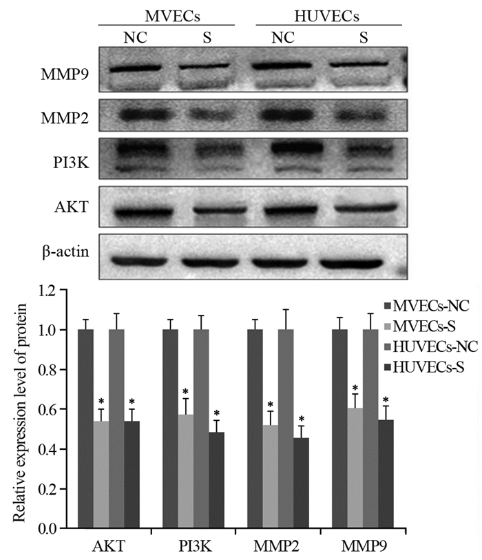 2.5 Western blot法检测骨髓瘤RPMI8226细胞中蛋白表达情况经条件培养基培养骨髓瘤RPMI8226细胞48 h后,Western blot法检测骨髓瘤RPMI8226细胞中CDK、CyclinD1、AKT、PI3K、MMP2、MMP9蛋白表达情况,与NC组相比,S组蛋白表达均降低(MVECs: P=0.0.023、0.003、0.015、0.001、0.034、0.021; HUVECs: P=0.0.035、0.005、0.021、0.002、0.025、0.032),见图 3、4。