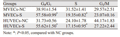 流式细胞仪检测各组细胞周期,见表 1。与NC组相比,S组骨髓瘤RPMI8226细胞的G0/G1期细胞数目明显增加、S期细胞数目减少,差异有统计学意义(MVECs: P=0.003、0.005; HUVECs: P=0.0.021、0.003)。