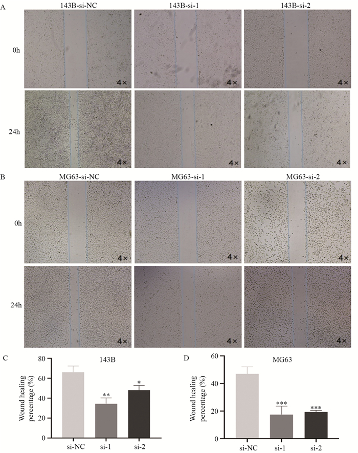 | *: P < 0.05, **: P < 0.01, ***: P < 0.001, compared with si-NC group. 图 4 敲低Sema6D对143B(A, C)和MG63(B, D)细胞迁移能力的影响 Figure 4 Effect of Sema6D knockdown on migration of 143B(A, C) and MG63(B, D) cells |