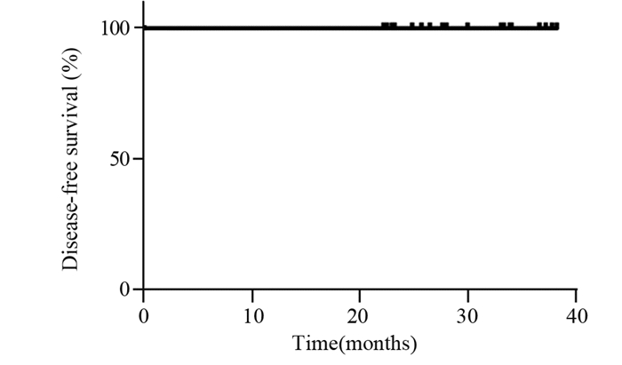 治疗结束后2年内每3个月随访1次,2~5年内每半年随访1次,5年后每年随访1次。对所有患者进行随访,截至2021年9月30日,随访率100%,随访时间21.3~37.1月,中位随访时间为30.1个月,21个月局部区域控制率、无病生存率均为100%,见图 1。随访期间患者肺部CT、心电图、心脏彩超均无2级及以上改变。随访期内,未观测到远期反应(如:皮肤纤维化、放射性肺炎、放射性心脏损伤等)。治疗完成率及乳房美容效果良好率达到100%。