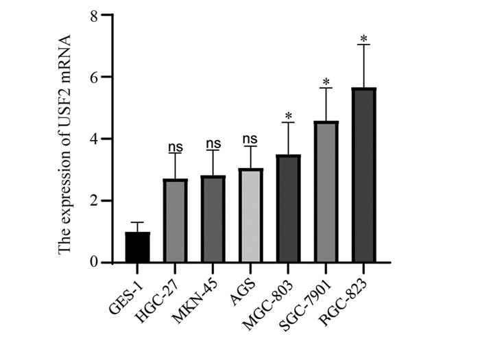 | ns: P > 0.05, compared with GES-1 group; *: P < 0.05, compared with GES-1 group. 图 1 胃癌细胞系和GES-1细胞USF2 mRNA的表达 Figure 1 USF2 mRNA expression in gastric cancer cell lines and GES-1 cells |