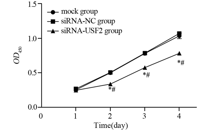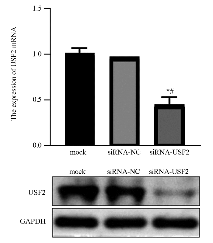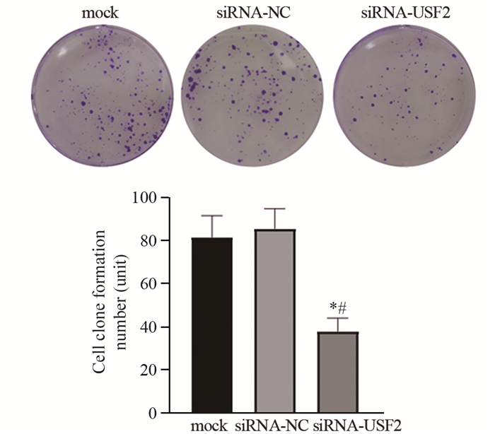 | *: P < 0.05, compared with mock group; #: P < 0.05, compared with siRNA-NC group. 图 2 各组BGC-823细胞中USF2 mRNA和蛋白的表达水平 Figure 2 The mRNA and protein expression levels of USF2 in BGC-823 cells |