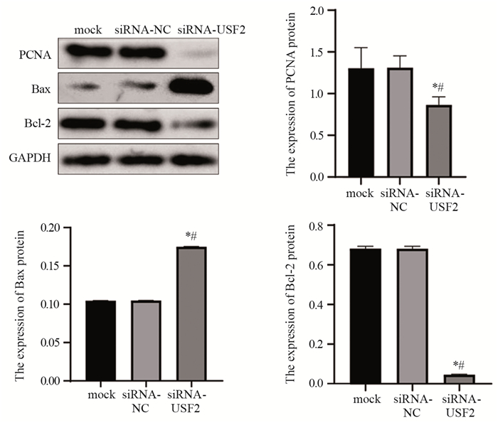 Western blot法检测显示,空白对照组、siRNA-NC组和siRNA-USF2组PCNA蛋白的表达量分别为1.30±0.25、1.21±0.14和0.86±0.10,siRNA-USF2组PCNA表达量明显降低,与空白对照组和siRNA-NC组相比差异均具有统计学意义(P=0.0487、P=0.0456)。空白对照组、siRNA-NC组和siRNA-USF2组Bax蛋白的表达量分别是1.10±0.00、0.10±0.00和0.18±0.00,siRNA-USF2组Bax蛋白的表达量明显升高,与空白对照组和siRNA-NC组相比差异均具有统计学意义(均P < 0.0001);空白对照组、siRNA-NC组和siRNA-USF2组Bcl-2蛋白的表达量分别是0.68±0.13、0.68±0.13和0.18±0.24,siRNA-USF2组Bcl-2蛋白的表达量明显下降,与空白对照组和siRNA-NC组相比差异均具有统计学意义(均P < 0.0001),见图 6。