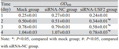 我国胃癌的发病率和病死率均处于较高水平[1-3]。胃癌的早期症状不明显,确诊时大多已经发展到晚期阶段。目前,胃癌的治疗手段主要是手术和放化疗,患者症状有所改善但总体生存率仍然不高。近年来,癌症基因层面的检测和治疗应用越来越广。上游转录因子2(upstream transcription factor 2, USF2)已被证实在多种肿瘤中发挥作用[4-5],本课题组前期的研究已经发现USF2在胃癌组织中高表达[6],但USF2基因是否参与胃癌细胞的增殖和凋亡尚不明确。本研究旨在分析USF2与胃癌细胞增殖和凋亡的关系,因此我们通过敲低胃癌细胞中USF2的表达,观察胃癌细胞增殖和凋亡的变化,为寻找胃癌诊疗的新思路提供依据。