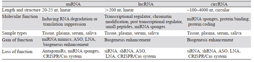 4 总结与展望非编码RNA在口腔癌的发生发展中起着重要的作用,参与了口腔癌大量生物过程。miRNA、lncRNA和circRNA对口腔癌生物学特性的影响、预后及治疗的相关研究内容见表 1。虽然有大量可用于肿瘤分子诊断和基因治疗的基因,但是绝大部分治疗肿瘤的核酸类药物仅处于临床Ⅰ期或Ⅱ期的实验阶段,大多数为miRNA模拟物和miRNA抑制物,基于lncRNA和circRNA的核酸类药物极少。肿瘤相关非编码RNA从基础研究到临床转化还有一段较长的路走,但前景依旧广阔。伴随着测序技术的进步,生物信息会发生爆炸式的增长,病例资料结合基因信息筛选肿瘤相关基因也必将成为研究者关注的重点。近年逐渐成熟的加权基因共表达网络分析可对基因关联模式进行分析,帮助研究者厘清基因表达、生物过程以及疾病之间的关系。随着对口腔癌研究的深入,希望通过基因表达模块与特定性状、表型之间的关联分析发现microRNA、lncRNA、circRNA和mRNA可能存在的规律,为口腔癌的诊断和治疗提供参考,总结出核酸与蛋白质结合的规律和功能位点,从而高效地开发出具有应用前景的口腔癌诊断标志物和治疗靶点。