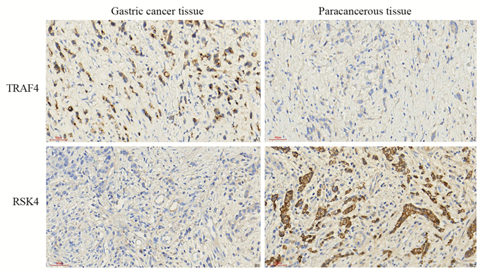 | 图 1 TRAF4和RSK4蛋白在胃癌和癌旁组织中的表达(IHC ×400, scale bar=40 μm) Figure 1 Expressions of TRAF4 and RSK4 protein in gastric cancer and paracancerous tissues (IHC ×400, scale bar=40 μm) |
