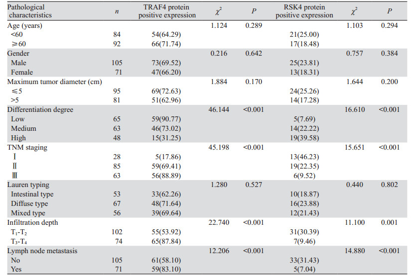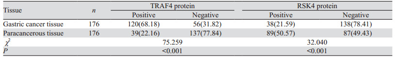 1.2 方法 1.2.1 TRAF4和RSK4蛋白表达检测纳入研究患者均采取腹腔镜胃癌根治术治疗,并于术中留取胃癌组织及癌旁组织(距肿瘤切缘外约3 cm)。将组织经10%甲醛固定,常规石蜡包埋制备成组织蜡块,使用免疫组织化学法测定TRAF4和RSK4蛋白表达。步骤如下:将胃癌及癌旁组织蜡块连续切片(4 μm)3张,常规脱蜡水化,然后进行抗原修复,再使用1%过氧化氢(H2O2)-甲醇消除内源性过氧化物酶,室温下静置10 min后PBS洗3次,5%血清白蛋白(BSA)孵育20 min,分别加入兔抗人TRAF4多克隆抗体及兔抗人RSK4单克隆抗体,4℃孵育过夜。次日37℃复温1 h,后PBS洗3次,分别加入山羊抗兔二抗抗体,室温孵育2 h,PBS洗3次后,二氨基联苯胺(DAB)进行显色,蒸馏水清洗终止显色,苏木精对比染色,充分水洗。脱水后,以中性树胶封固,于显微镜下观察。同时用PBS代替一抗作为阴性对照。