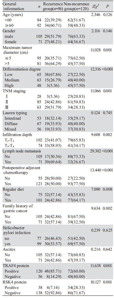 胃癌是起源于胃黏膜上皮细胞病变的消化道恶性肿瘤,具有较高的发病率与死亡率[1]。基因突变、不良饮食结构、病菌感染及吸烟等因素均可诱发胃癌。与传统开放根治手术相比,腹腔镜胃癌根治术因具有创伤较小、术后恢复较快等特点,已成为临床治疗胃癌的主要外科手段,可有效提高患者生存质量,延长生存期,但仍有部分患者在术后出现复发,严重影响患者预后[2]。因此,积极探讨影响胃癌腹腔镜根治术后复发的相关因素,以指导临床制定合适的防控措施,对减少患者术后复发具有重要意义。近年来,有研究显示[3]有多种基因、细胞因子及化合物参与了肿瘤细胞的发生发展过程,其中肿瘤坏死因子受体相关因子4(tumor necrosis factor receptor associated factor 4, TRAF4)和核糖体S6蛋白激酶4(ribosomal s6 protein kinase 4, RSK4)在肿瘤细胞中存在异常表达。TRAF4属于TRAF家族类蛋白,可介导肿瘤细胞内信号传递,有研究指出[4]TRAF4在乳腺癌、结直肠癌等肿瘤组织中高表达。RSK4为核糖体S6蛋白激酶家族成员之一,参与丝裂原活化蛋白激酶(mitogen-activated protein kinase, MAPK)信号通路的转导,具有调控细胞生长、增殖、分化的作用,有研究指出[5]RSK4蛋白在结直肠癌细胞株中低表达,可能参与了结直肠癌的发生发展。以往研究大多是对TRAF4或RSK4蛋白在癌细胞中的作用及其与患者临床病理特征的关系进行分析,但关于TRAF4和RSK4蛋白表达是否与胃癌患者腹腔镜根治术后复发相关不甚明确。鉴于此,本研究探讨了胃癌组织TRAF4和RSK4蛋白的表达与患者腹腔镜根治术后复发的相关性,旨在为临床制定合适的防控措施提供参考依据。