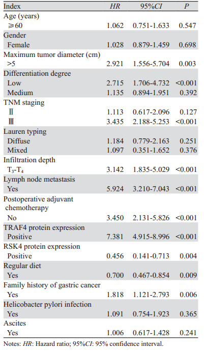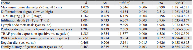 结果显示最大肿瘤直径 > 5 cm、低分化程度、TNM分期Ⅲ期、浸润深度T3~T4、淋巴结转移、术后未辅助化疗、TRAF4蛋白阳性表达、家族胃癌病史均是腹腔镜胃癌根治术后患者复发的危险因素(P < 0.05),而RSK4蛋白阳性表达、规律饮食是保护因素(P < 0.05),见表 5。