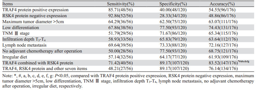 胃癌组织TRAF4和RSK4蛋白表达联合预测胃癌腹腔镜根治术后复发的准确度高于各蛋白单独预测(χ2=34.566、47.239, P < 0.001),且高于最大肿瘤直径 > 5 cm、低分化、TNMⅢ期、浸润深度T3~T4、淋巴结转移、术后未辅助化疗、未规律饮食(χ2=18.810、4.380、15.286、17.902、6.588、10.570、20.682,P=0.000、0.036、0.000、0.000、0.010、0.001、0.000),而与TRAF4、RSK4蛋白表达联合其他七项比较差异无统计学意义(χ2=2.982, P=0.084),见表 7。