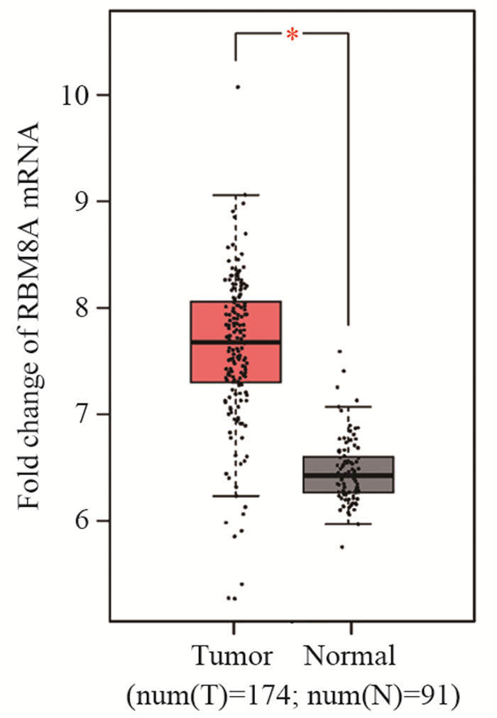 | *: P < 0.05; T: endometrial cancer tissues; N: normal endometrial tissues. TCGA data showed that the expression of RBM8A in endometrial cancer tissues (174 cases) was higher than that in normal endometrial tissues (91 cases), and the difference was statistically significant. 图 1 TCGA示RBM8A在正常子宫内膜和子宫内膜癌组织中的差异表达 Figure 1 TCGA showed that the expression of RBM8A was different in normal endometrial and eddometrial cancer tissues |