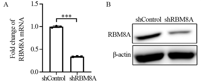 1.3.5 流式凋亡检测取对数生长期细胞,制成单细胞悬液,按1×106细胞/孔接种于6孔板。次日,细胞贴壁后,加入等量病毒上清液(其中无意义序列shControl为对照组,shRBM8A为实验组),继续培养72 h,细胞用不含EDTA的胰酶消化至皿底呈花斑状,用完全培养基终止消化后转移至15 ml离心管,转速300 g,4℃离心5 min,弃上清液。用预冷的PBS 300 g离心力,4℃离心5 min,洗涤细胞两次,吸去PBS,加入100 μl 1×Binding Buffer重悬细胞。加入5 μl Annexin V-FITC和10 μl PI染液,轻轻混匀。避光、室温反应10~15 min。样品在1 h内用流式细胞仪检测,结果用FlowJo_V10软件分析。实验重复3次。
