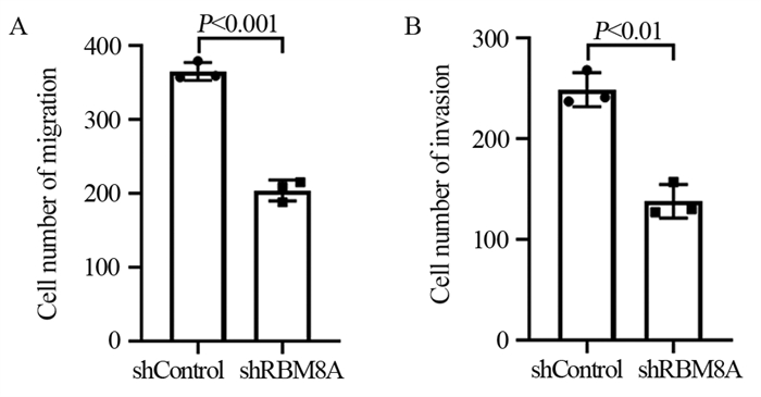 1.3.4 Transwell实验取Transwell小室置于24孔板,将shControl、shRBM8A组HEC-1A细胞,胰蛋白酶消化,完全培养基终止消化,离心后弃上清液,用无血清的培养基重悬,使其细胞密度为5×105个/毫升。迁移试验:取上述重悬细胞,上室加入200 μl细胞悬液,下室加入700 μl含10%胎牛血清的培养基。培养48 h后,取出小室,PBS清洗3次,棉签轻轻擦拭上室细胞,4%多聚甲醛固定15 min,0.4%结晶紫染色5 min,PBS清洗干净并晾干,显微镜下随机取5个视野细胞计数并取平均值。侵袭试验:将基质胶与无血清培养基按1:8稀释后,均匀铺在Transwell小室底部膜的上室面(50 μl),室温干燥后待用。上室加入上述细胞悬液100 μl,下室内加入700 μl含10%胎牛血清的培养基。后续操作同迁移试验,所有实验重复3次。