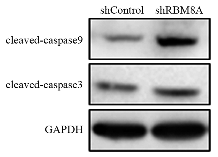 敲低RBM8A后,HEC-1A细胞中cleaved-caspase9及cleaved-caspase3表达明显升高,见图 6。说明敲低RBM8A激活了细胞内源性凋亡通路。
