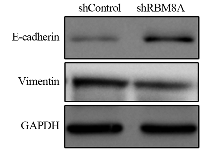 1.2 抗体与试剂RBM8A抗体购自美国Proteintech公司,E-cadherin抗体、Vimentin抗体、cleaved-caspase9、cleaved-caspase3抗体及GAPDH内参均购自美国CST有限公司。RBM8A敲低质粒及空载质粒构建由上海吉凯基因化学技术有限公司完成。反转录试剂盒及2×SYBR Green qPCR Mix试剂盒均购自上海翊圣生物科技有限公司。CCK-8试剂盒购自上海碧云天生物技术有限公司。1×Bradford蛋白定量试剂盒购自美国Bio-Rad公司。Transwell小室购自美国Corning公司。RBM8A引物及GAPDH内参引物由北京擎科生物科技有限公司合成。RBM8A引物:正义:5’-GATGGGGACGAGAGCATTCAC-3’,反义:5’-CGCTGTCATAATCCTCACGCA-3’;GAPDH内参引物:正义:5’-CTGGCCAAGGTCATCCATGAC-3’,反义:5’-CTTGCCCACAGCCTTGGCAG-3’。