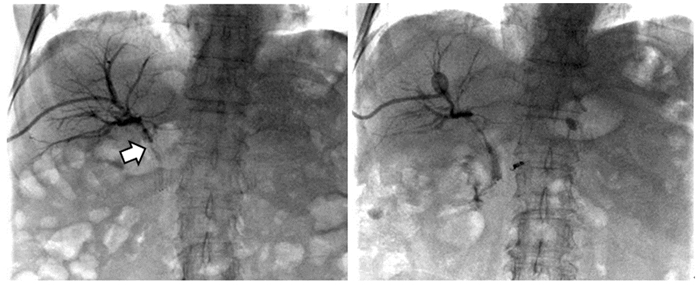 | 图 1 患者老年女性,胆道恶性肿瘤合并胆道狭窄,支架后再次出现皮肤巩膜黄染,PDT术前胆道造影见支架内充盈缺损(箭头处),对比剂无法顺利通过(左图);PDT治疗1月后再次造影见支架恢复通畅,对比剂可顺利通过并进入肠道内(右图) Figure 1 An elderly female patient with biliary malignancy complicated with biliary stricture, presented with yellow staining of skin and sclera after stenting. Biliary angiography before photodynamic therapy (PDT) showed a filling defect in the stent (arrow), and the contrast agent could not pass smoothly (left). One month after PDT, the stent was unobstructed again and the contrast agent could pass through and enter the intestine smoothly (right) |
