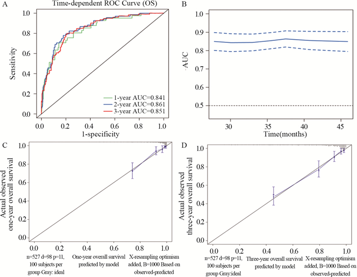 | 图 3 预测测试队列中的O S率的时间依赖性ROC曲线(A)、AUC曲线图(B)、一年(C)及三年(D)校准曲线 Figure 3 Time-dependent ROC curve(A), time AUC(B), one-year (C) and three-year(D) calibration curve for predicting OS rate in the test cohort |