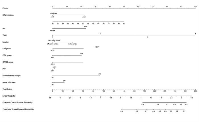 | 图 2 结直肠癌患者OS预后模型的列线图 Figure 2 Nomogram of OS prognosis model in patients with CRC |