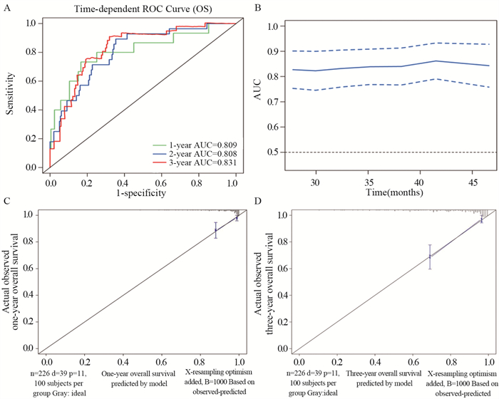 测试队列一共包括226例患者。1年和3年的时间相关ROC曲线用于验证模型的性能,见图 3A。同时,在测试队列中,1年和3年OS率的AUC值分别为0.809和0.831,见图 3B。校准曲线显示1年和3年OS率的预测和观察结果之间具有良好的一致性,OS的Brier评分分别为0.023和0.065,见图 3C~D。