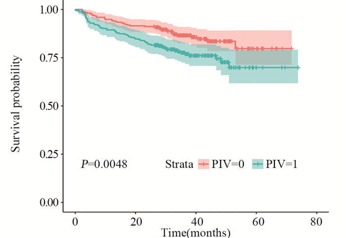 随访时间为0.1~73.8个月,中位随访时间36.9个月。Kaplan-Meier法和对数秩检验结果显示,PIV高水平组患者的OS明显短于PIV低水平组(P=0.0048),见图 4。